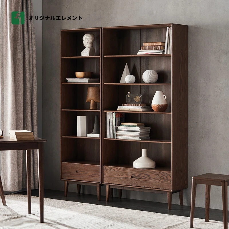 原材料にこだわった!全実木の書棚・ディスプレイキャビネット。オーク材とウォールナット色のコンビネーションが魅力的な北欧スタイルの書房用収納ラック F8171。おしゃれで機能的な収納で、心地よい空間を演出します。