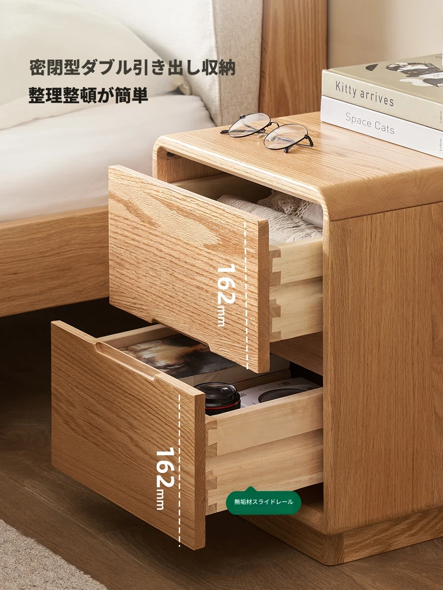 原材料にこだわった無垢材のベッドサイドキャビネット - モダンシンプルなオーク製の収納棚!大容量のダブル引き出し付き、スリムなデザインで省スペースにも最適。L7029モデルで、お部屋をおしゃれに演出します!