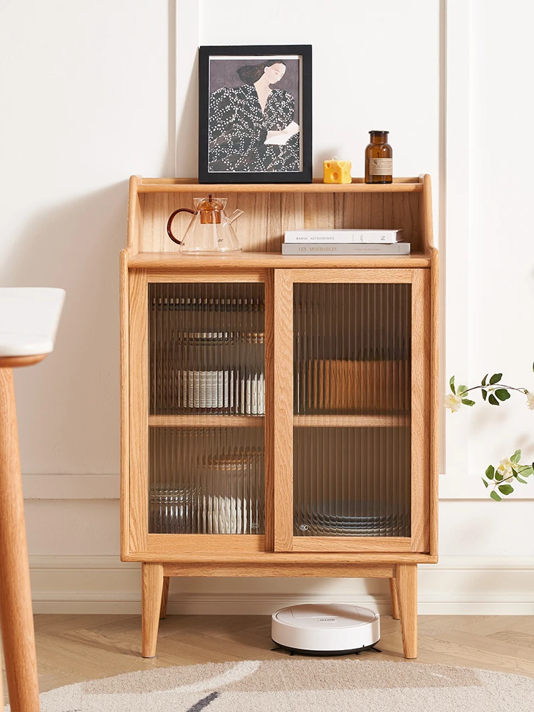 原木の魅力を引き立てるモダンなキッチン用ハイキャビネット - 天然オーク製の食器棚、家用ティーキャビネット F8142 で、スタイリッシュな収納を実現!