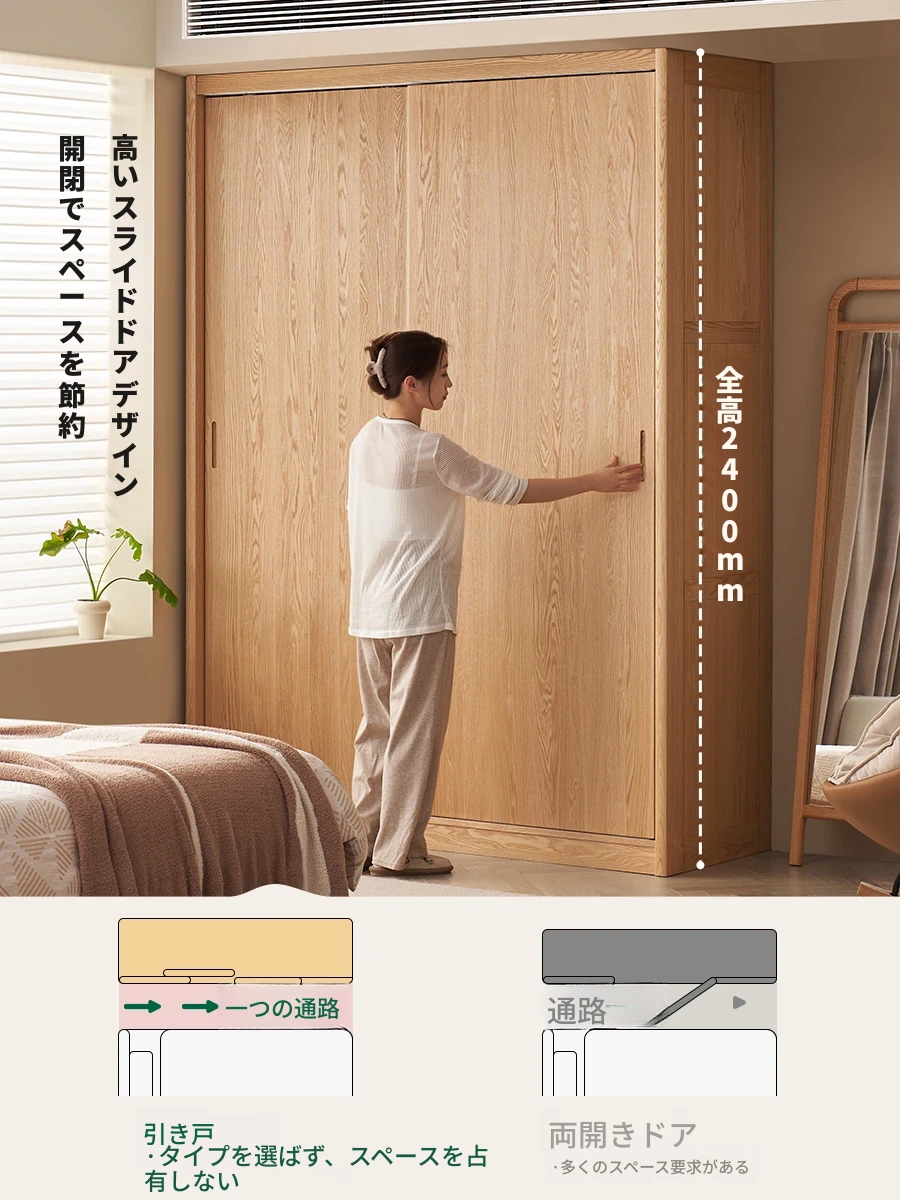 原材料無垢材使用のモダンミニマリスト衣装ダンス - 2.4mの高いオーク製大容量衣類収納、狭い寝室にもぴったり!H6041