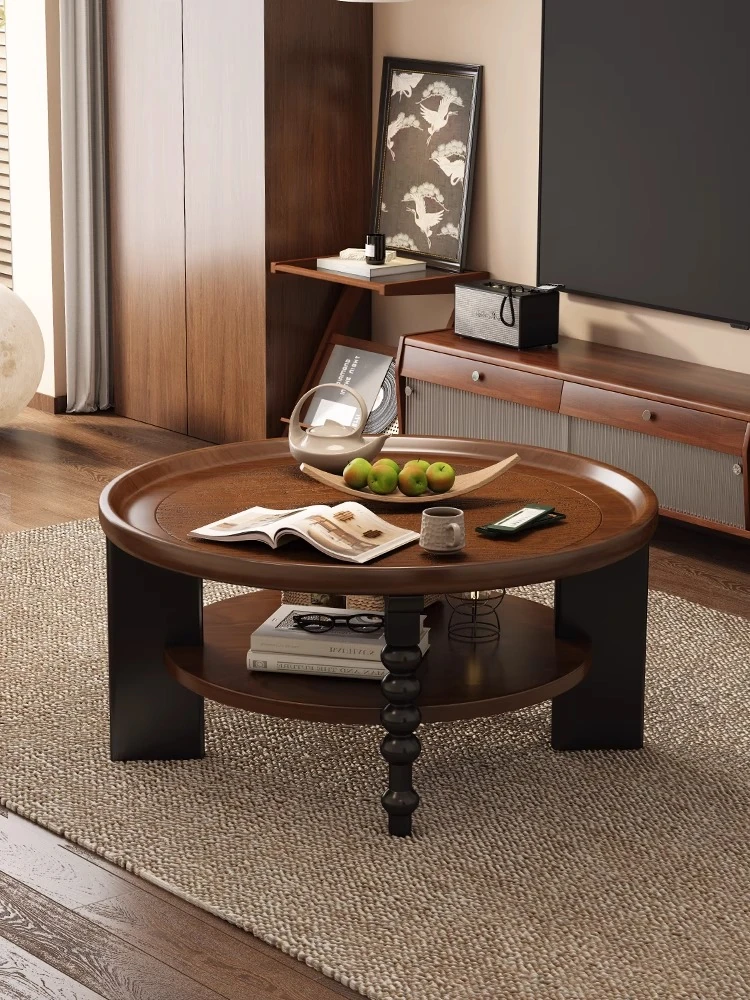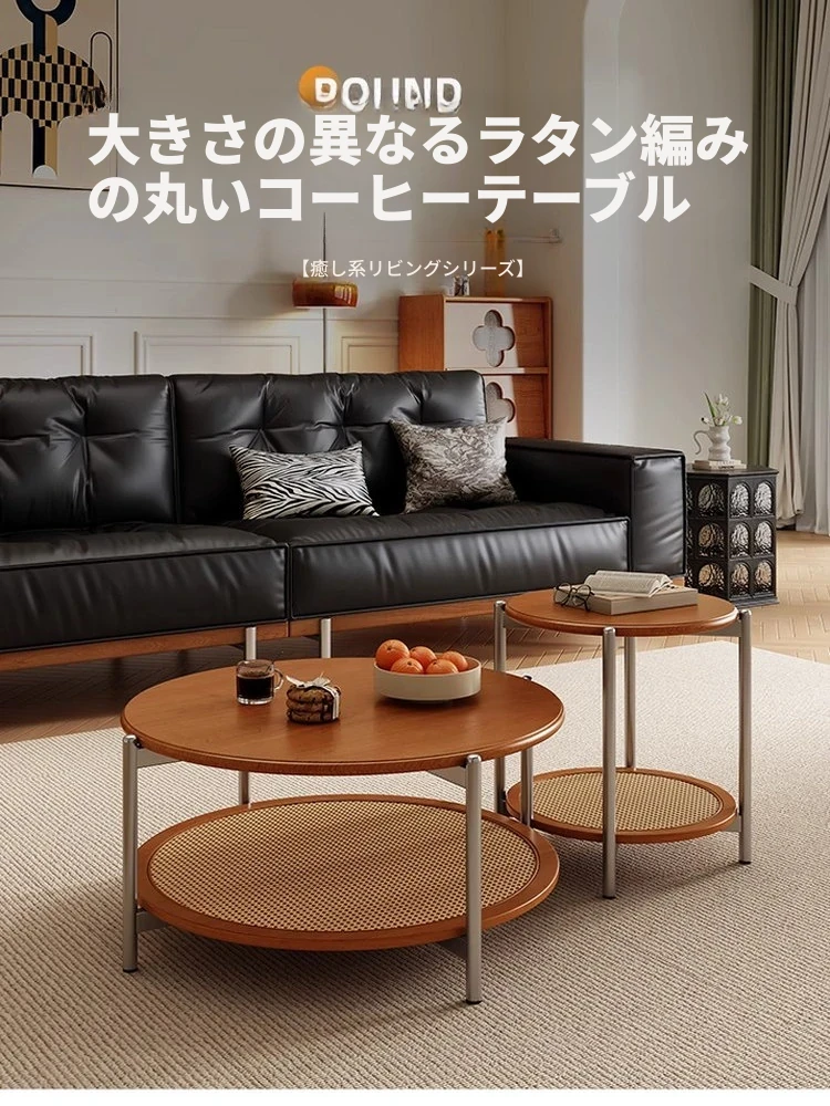 レトロスタイルのウッド編みラウンドコーヒーテーブルセット - 小型リビングに最適なアンティーク調のデザイン、ソファサイドテーブルとしても使用可能!おしゃれで機能的な空間を演出します。