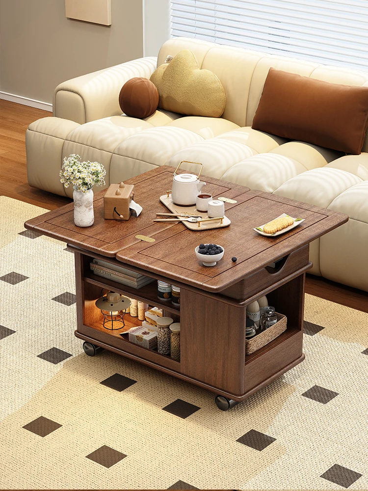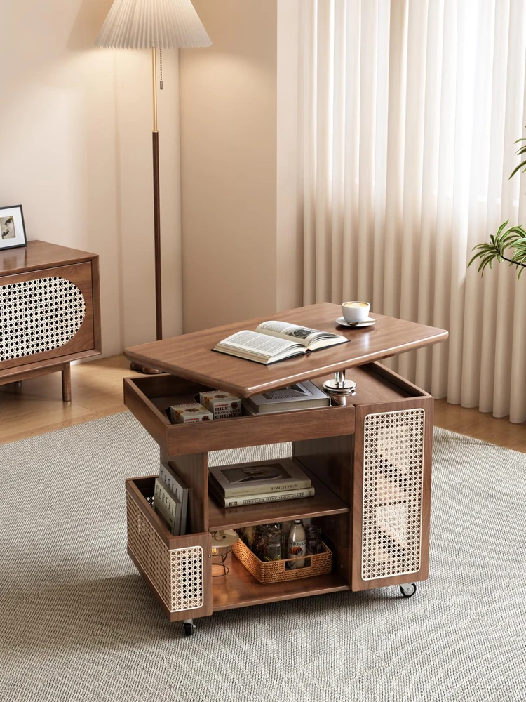 天然木製の昇降式コーヒーテーブル - 移動可能な多機能収納サイドテーブル、キャスター付きのレトロデザインで小型スペースに最適!おしゃれなインテリアを演出しながら、便利さも追求した一品です。