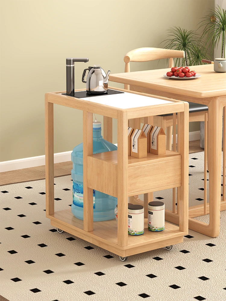 モダンシンプルな天然木製の移動式ティーサイドキャビネット - おしゃれなソファサイドテーブル、電気ケトル一体型、スタイリッシュな石板ティーテーブル、キャスター付きで使い勝手抜群!