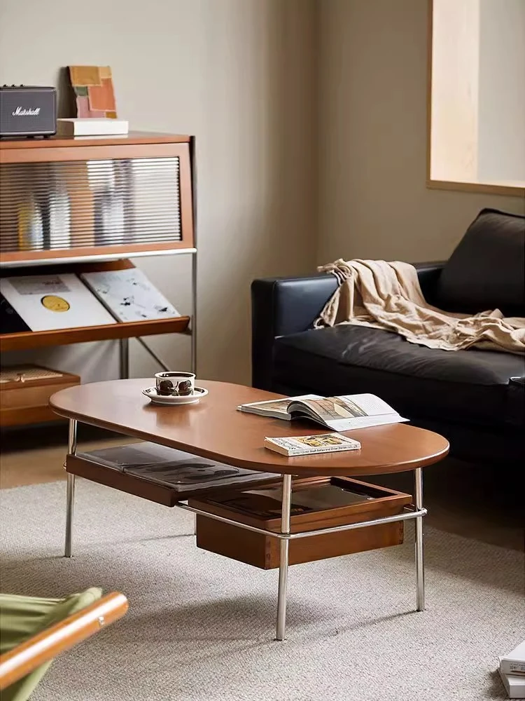 ヴィンテージ風の無垢材オーバル型コーヒーテーブル、ステンレス脚付きのロングソファサイドテーブル、収納付きのレトロなロー・テーブル。おしゃれで機能的、あなたのリビングを格上げするアイテムです!