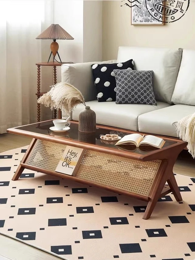 レトロな無垢材とラタン編みのガラステーブル、ヴィンテージ風のリビングルームにぴったりのソファサイドテーブル。北欧スタイルの収納機能付きコーヒーテーブルで、あなたの空間をおしゃれに演出します!
