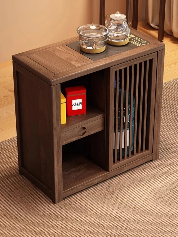 新中式デザインの無垢材収納ティーキャビネット - 扉付き&引き出し付き、ティーテーブル&移動式サイドテーブル、湯沸かしポット一体型ティーテーブルで、優雅なティータイムを演出!